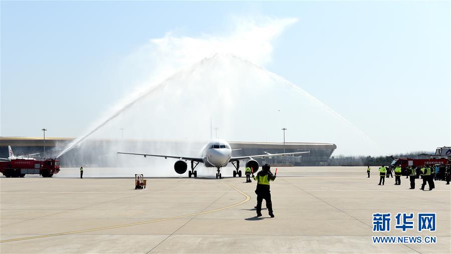 3月18日,合肥新桥国际机场举行“过水门”仪式迎接从武汉返回的安徽援鄂医疗队所乘航班。 新华社发(周牧 摄)