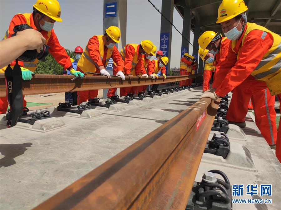 6月3日,工人在北京至雄安城际铁路(河北段)铺轨施工现场进行铺轨作业。当日,在北京至雄安城际铁路(河北段)铺轨施工现场,一组500米长钢轨平稳落在无砟道床上,标志着京雄城际铁路(河北段)建设进入铺轨阶段。京雄城际铁路分两段建设运营,其中大兴机场段设计时速250公里,已于2019年9月开通运营;大兴机场至雄安段设计时速350公里,预计2020年底开通运营。 新华社记者 齐中熙 摄