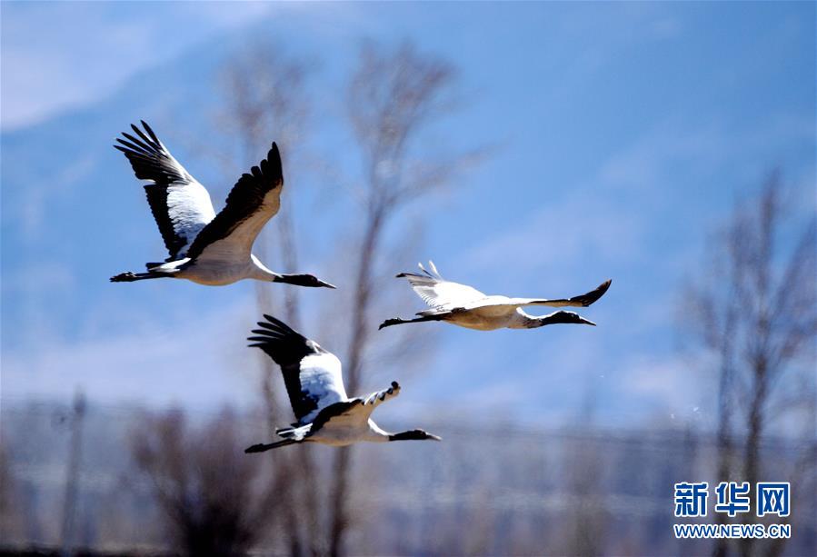 1月11日,黑颈鹤在拉萨市林周县虎头山水库周边的村庄飞翔。新华社发(李伟明摄)