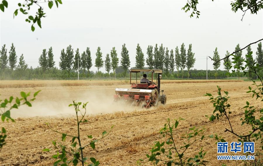 6月21日,河北省河间市景和镇丰尔庄村农民在田间播种玉米。 时下,河北省各地农民抓住有利时机,在抢收小麦的同时播种玉米,确保不误农时。 新华社记者 朱旭东 摄