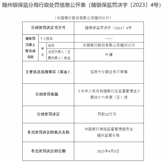 中国经济网北京4月11日讯 银保监会网站10日发布随州银保监分局行政处罚信息公开表(随银保监罚决字〔2023〕4号),中国银行(3 460,0 0