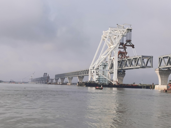 新华网达卡5月6日电(刘春涛 段永红)5月4日,中国建造的万吨级中心架梁起重船天一号将重约3200吨的钢梁架设到孟加拉国帕德玛大桥的指