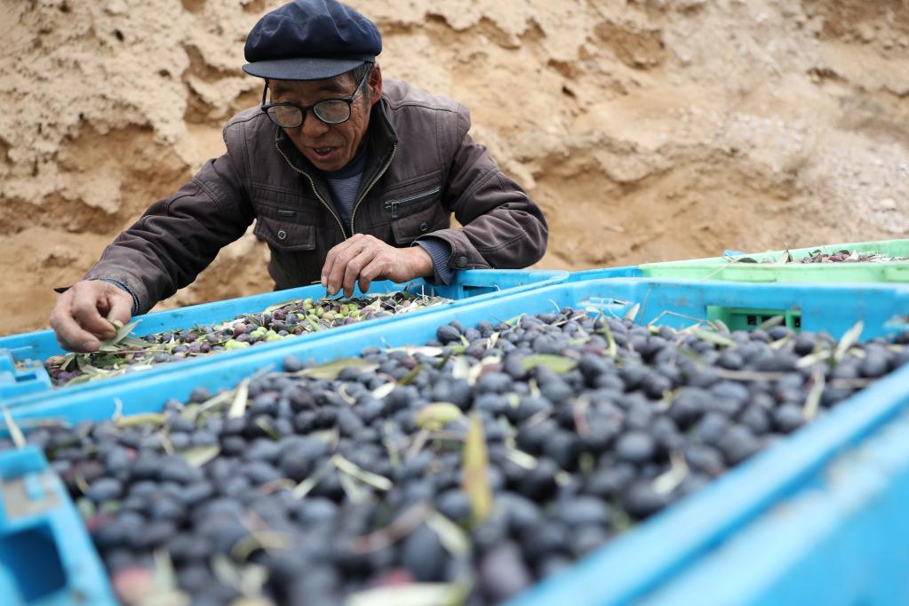 在甘肃陇南市,农户在整理刚刚采摘的油橄榄。新华社记者 陈斌 摄
