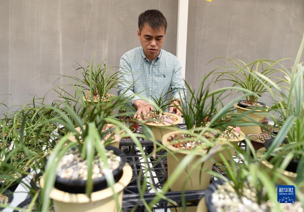 浙江省绍兴市柯桥区漓渚镇棠棣村的村民在照料兰花(2018年4月25日摄)。新华社记者 韩传号 摄