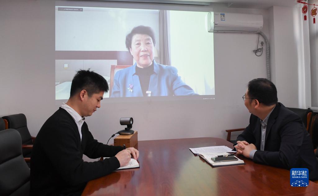 3月8日,全国人大代表、山西省昔阳县大寨镇大寨村党总支书记郭凤莲在驻地与农业农村部工作人员视频连线。新华社记者 胡喆 摄