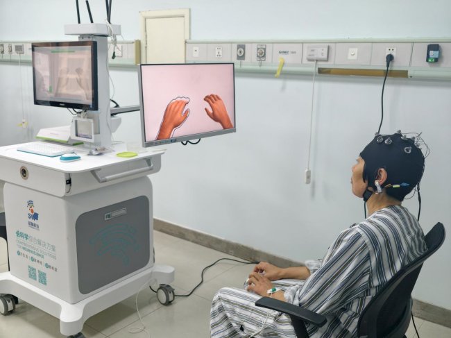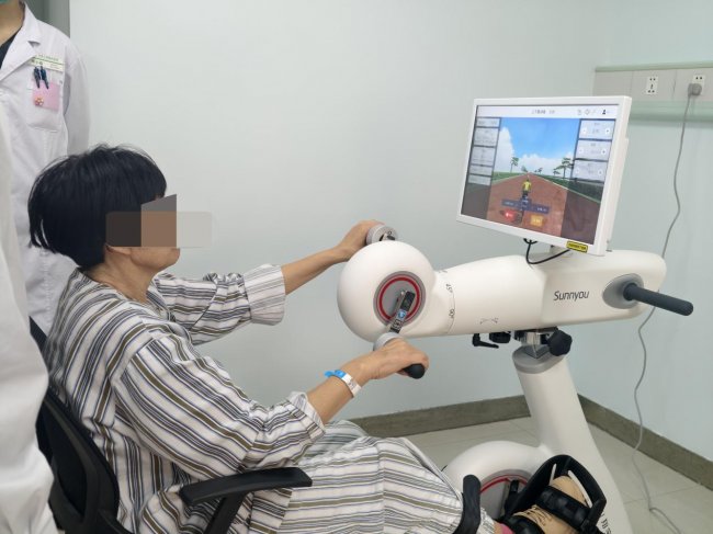 新病房配备多台专业脑机接口康复设备,包括外骨骼机器人及针对上肢、下肢、手部以及吞咽咀嚼等功能的智能训练系统,可实现脑功能精准评估与多维神经调控。60岁的刘阿姨脑卒中后右侧偏瘫,通过脑机接口进行上下肢康复训练,完成简单肢体动作。“该系统通过视觉采集信号,再经脑电分析处理后引导患者用意念控制设备,相比传统的康复效率更高”赵萌主任介绍。