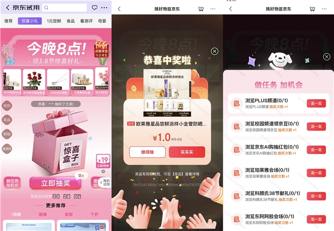 其中,3月4日,京东试用将送出新疆有机大红枣、手剥阿富汗瓜子鲍鱼果仁等试吃礼;3月5日,将送出正官庄红参液、长白山人参、、胶原蛋白肽、Swisse等春季滋补品试用礼;3月6日,将送出普拉达粉底液、毛戈平粉底+唇釉套组、赫莲娜白绷带等百大品牌试用装;3月7日,提供希思黎全能乳液、雅萌精华面膜、口腔小美盒、十月结晶卫生巾安睡裤组套等试用;3月8日,全品类试用礼惊喜掉落。