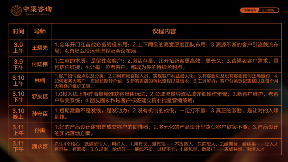 三天两夜的课程,不仅是一次知识的盛宴,更是一次能量的共振。从中梁咨询总经理的战略领航,到六位导师分别从激活、客服、私域、激励、产品、人才六大维度的深度拆解,再到两位企业家的实战印证,整个课程形成了一个从“道”到“术”,从“战略”到“执行”的完美闭环。