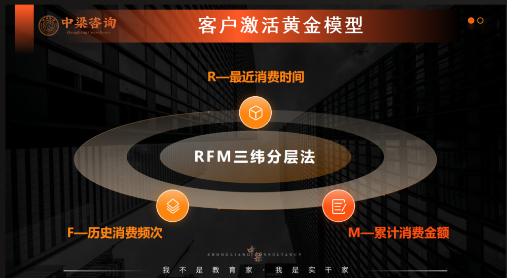 生意的本质,是留住老客户,并让他们成为你的持续盈利点,RFM三纬分层法是客户激活黄金模型,如果你想学习更多激活沉睡客户的方法,记得贯注中梁咨询宫种浩!