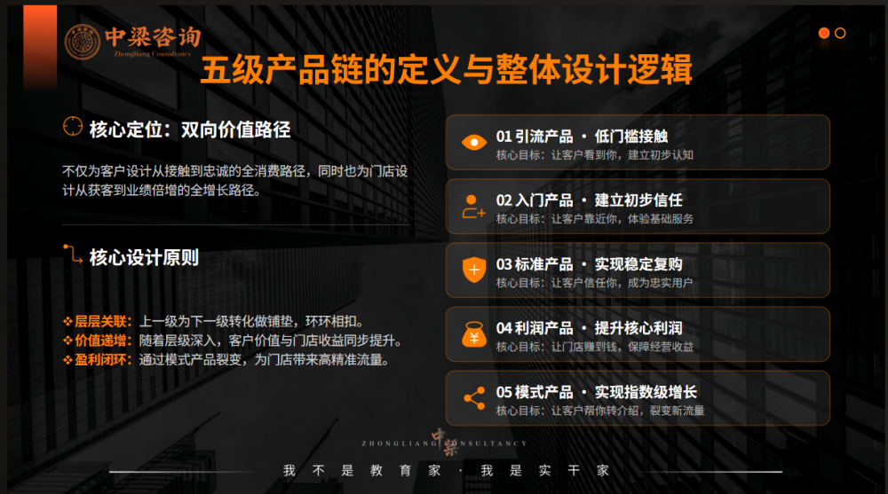 他通过“代言人卡”、“解锁卡”、“消费型股东”等生动的案例,展示了如何通过层层递进的产品设计,让客户沿着你设计的路径,从“一生一次”的消费走向“一生一世”的追随。想详细了解五级产品链设计的方法,请关注中梁咨询gongzhonghao!