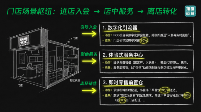 除了常规的食材销售,门店还承担着进店、店中、离店三大会员动线运营的核心功能,即构建从进店引导入会 → 店中利他服务 → 离店远程转化的场景营销: