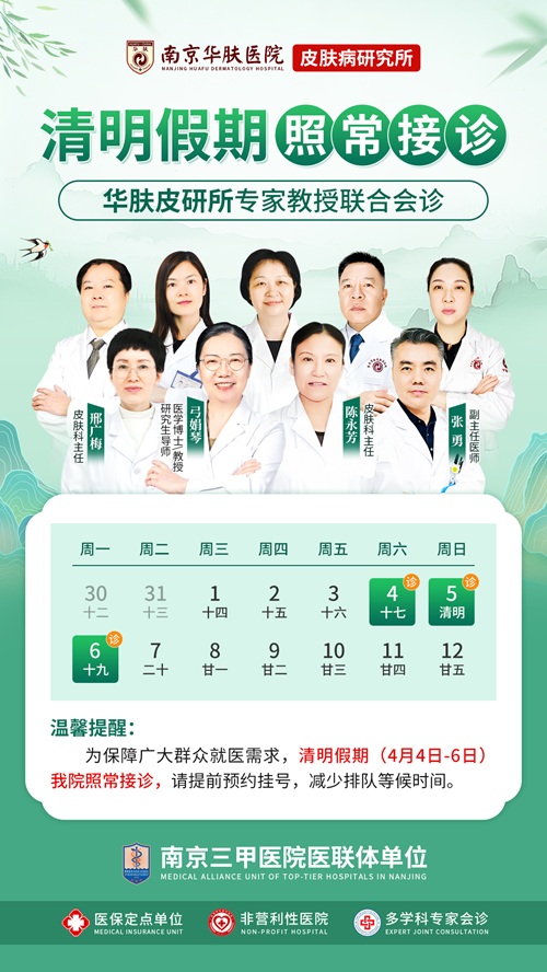 皮肤问题频发,清明来南京华肤皮肤病研究所就诊正当时。春暖花开,正是踏青祭扫、出行游玩的好时机。然而,春季也是皮肤问题的高发期——花粉过敏、日光性皮炎、蚊虫叮咬、湿疹……各种皮肤困扰可能随时“找上门”。为保障广大市民在清明假期期间也能及时获得专业的皮肤诊疗服务,南京华肤皮肤病研究所郑重公告:清明假期(4月4日-4月6日),我院门诊正常接诊,各项诊疗服务照常开展,守护您的皮肤健康“不打烊”!