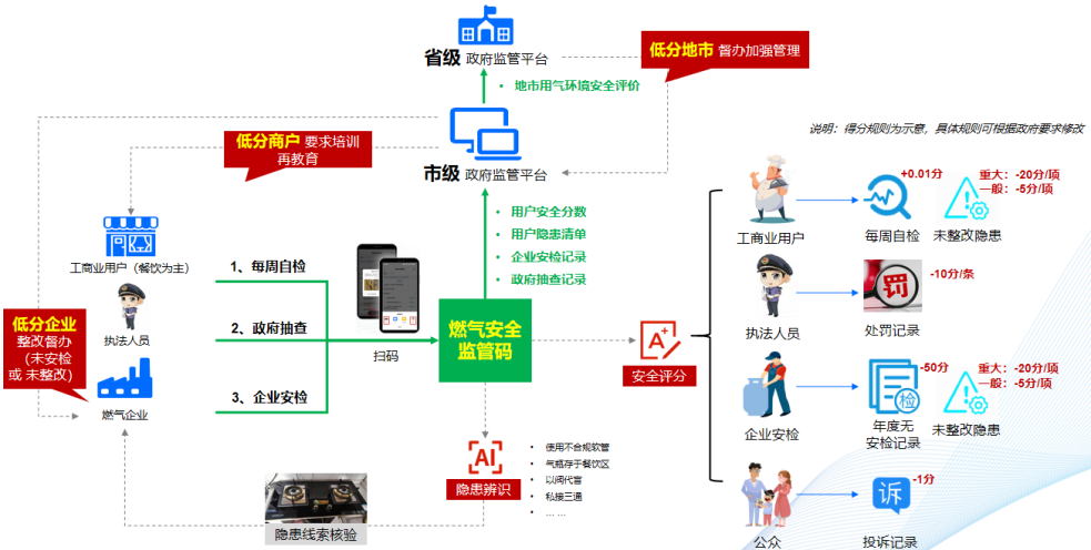 方案还创新设计覆盖“商户-企业-地市(区县)”的三级量化评分功能,将自查、检查、投诉等多维度数据纳入评分体系,实现安全水平可视化评估,形成“识别-评分-预警-整改-复查”的完整闭环。