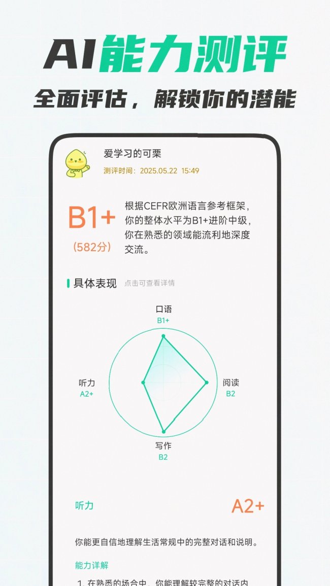 想要快速提升,关键是"精准练+高频练":每天保证10-15分钟的针对性口语练习,重点攻克中考核心场景(比如话题讨论、演讲),同时要有专业反馈纠正发音和语法错误。可栗口语的AI教练能精准定位薄弱项,定制专属练习计划,让每一次练习都有效,平均2个月就能看到明显提升。