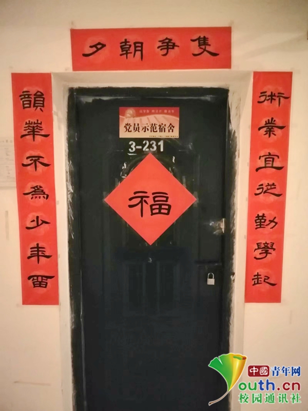 图为大学生在宿舍门口贴的创意春联“考试不挂科,查寝不扣分”。南昌工学院团委供图