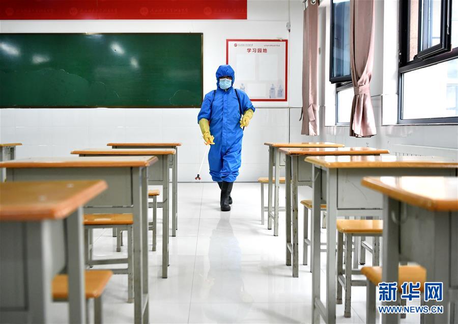 3月24日,在陕西师范大学附属中学,学校工作人员进行教室消杀演练。 当日,西安市雁塔区在陕西师范大学附属中学举行开学疫情防控演练活动。演练模拟学生入校、晨检、发热应急处置等环节,帮助学校教师熟练疫情防控流程,保障开学复课工作安全顺利进行。按照陕西省教育厅2020年春季学期开学工作安排,3月30日,西安市高三年级开学;4月7日,初三和中职学校毕业班开学。 新华社记者 张博文 摄
