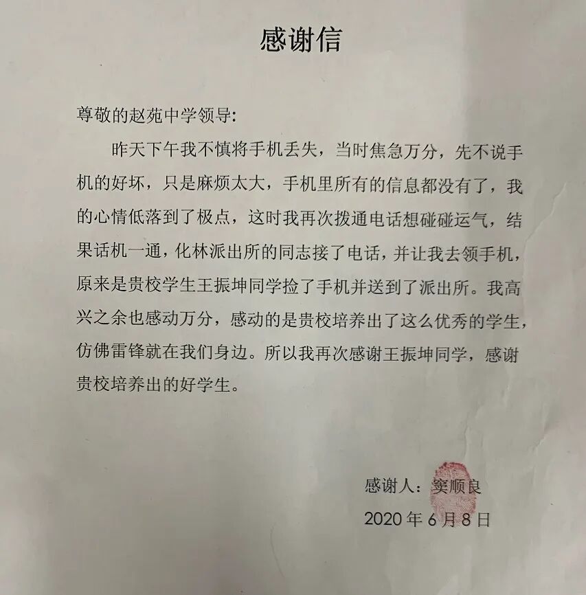 6月8日,邯郸市赵苑中学校门口来了一位不速之客,将一封感谢信交到了校长手里。