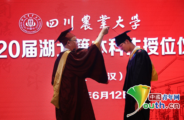 中国青年网北京6月15日电(记者 王龙龙 通讯员 王东林)6月12日下午,四川农业大学2020届湖北籍本科毕业生授位仪式在武汉举行。该校党委副书记张强率队,从四川前往武汉,为因疫情而无法返校的毕业生一一拨穗和授予学位。