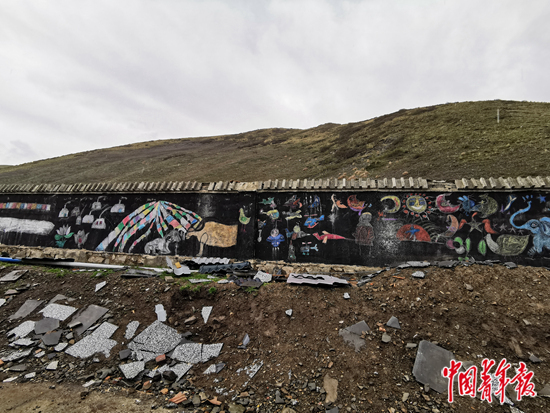 学校里有一面墙,现代文明的痕迹与传统游牧的习俗,被学生们画在了一起。画上有五彩经幡、雪山羊群,有绚丽的格桑花和温暖的毡房,以及穿着藏袍大笑的孩子。画上还有直升飞机、火箭和飞碟。