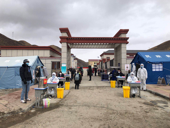 学校的防疫工作开始了,食堂前架起了一个大水桶,给孩子们洗手用。老师们换上了从头裹到脚的防护服,站在校门口。