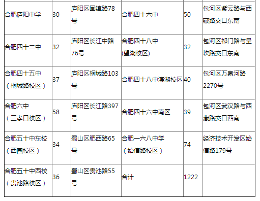 6月24号上午,合肥市教育考试院向社会公布了市区高考考生的考点考场信息。今年高考考点新增合肥五十中天鹅湖教育集团蜀外校区、合肥四十二中和合肥四十六中南校区三个考点,合肥三十八中作为特殊类型考点,安排申请残疾(视觉残疾、肢体残疾、听障等)便利考场、小语种(日语、德语、法语)考场和少年班考场共26个。