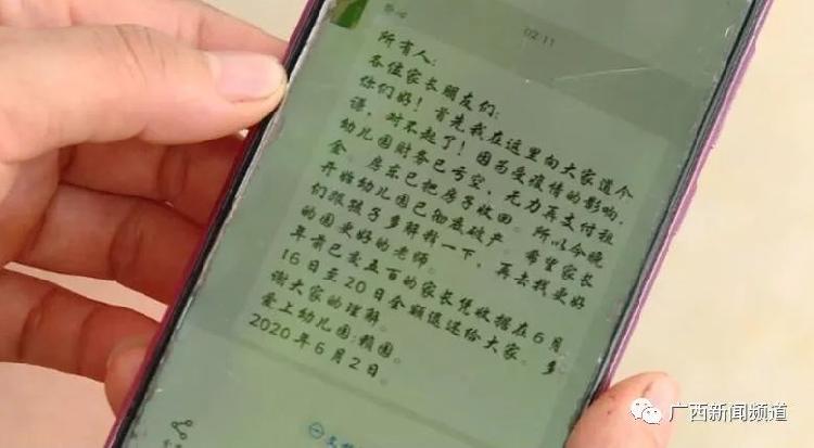 家长们向记者出示了启卓幼儿园园长,同时也是老板赖春燕所发的破产消息,上面说幼儿园财务亏空,无力支付房租,房子已经被房东收回。消息上还称,之前预交的500元学费会凭收据全额退还给家长。