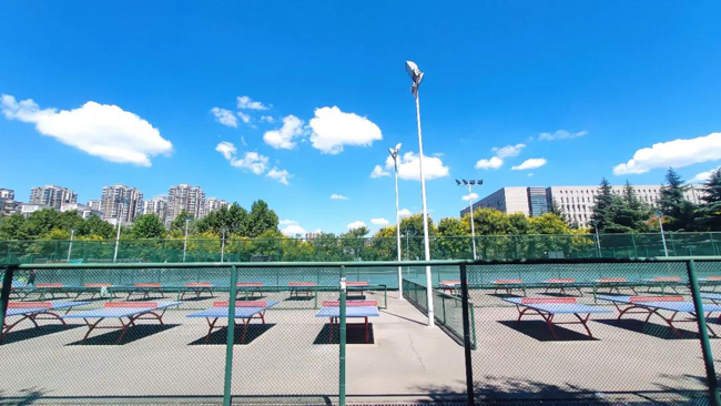 行走在操场旁,能听见拍打篮球和锻炼的声音。