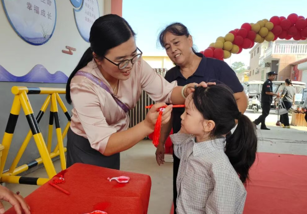 仪式首项为“校长朱砂启智”,校长用蘸有朱砂的毛笔,在一年级新生额头点上红痣,寓意开启智慧、眼明心亮。随后是“小手印大梦想”环节,孩子们蘸取颜料,在班级画板按下手印,以独特印记承载未来憧憬。