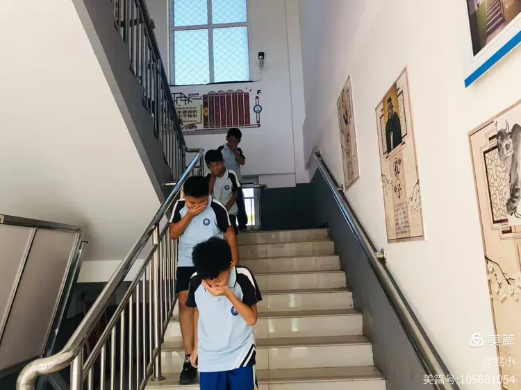 随着警报声响起,消防应急疏散演练正式开始,全校学生在老师的组织下,捂住口鼻、弯着腰,按各班疏散路线安全有序地撤离到操场指定位置集合。