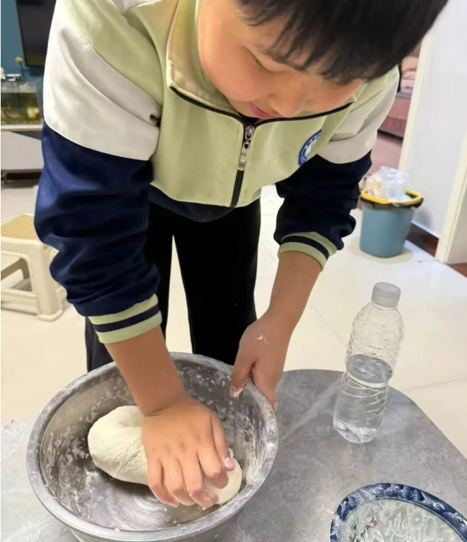 揉面环节更是对同学们耐心和毅力的考验。刚开始,大家充满干劲,双手用力按压、揉搓,但没过多久,手臂就开始酸痛,有的同学揉了几分钟就觉得“差不多了”,结果面团内部松散,根本达不到“三光”(盆光、手光、面光)的标准。老师发现后,示范了揉面的正确姿势,强调“揉面要像打太极,刚柔并济,还要有耐心”。在老师的鼓励下,同学们重新振作精神,有的轮流接力揉面,有的跟着节奏喊着口号给自己打气。当看到原本松散的面粉逐渐变成光滑、有弹性的面团时,四年级的王同学兴奋地说:“揉面好累啊,但看到面团变得听话的那一刻,感觉特别有成就感!”