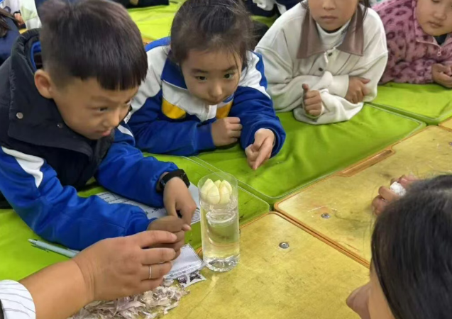 最令人期待的种植环节来了!同学们将剥好的蒜瓣小心地放入透明的容器中,再注入适量的清水,让蒜瓣底部接触到水,为其生长提供充足的水分。看着自己亲手种植的大蒜“安家落户”,同学们的眼中满是期待,仿佛已经看到嫩绿的蒜芽破土而出的模样。