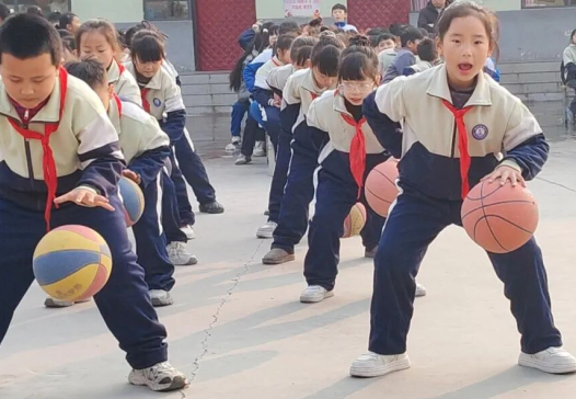 活动现场,各班学生身着统一校服、佩戴红领巾,手持篮球在校园广场整齐列队。随着音乐响起,孩子们弯腰持球、摆臂律动,篮球在掌心与指尖灵活翻转,整套韵律操动作整齐划一,稚嫩的动作里透着认真与活力,展现出南沿村完小学生扎实的篮球基本功和昂扬向上的精神面貌。党员教师们穿梭在队伍中,纠正动作、鼓励学生,用实际行动践行育人使命。