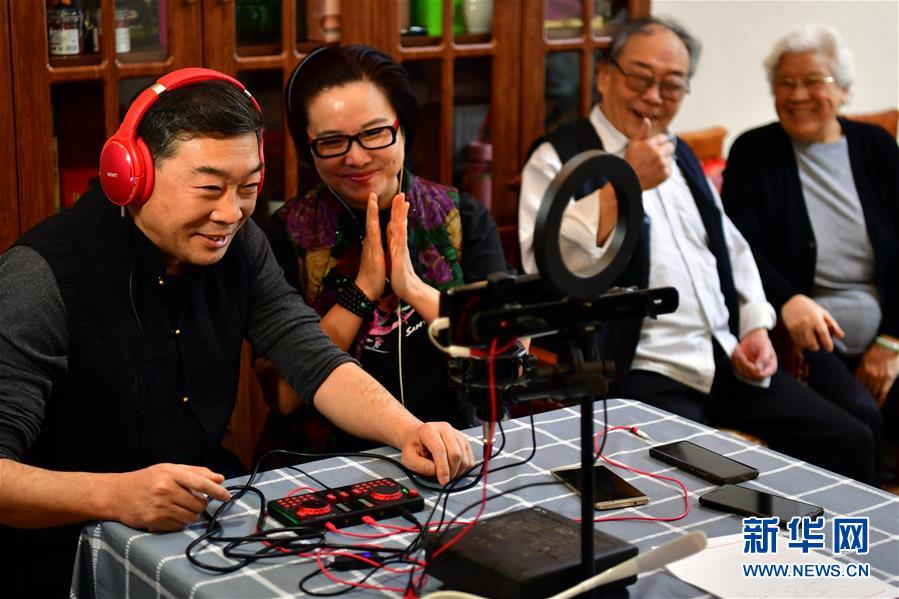 阎惠贞(右)在和直播平台的戏迷打招呼(3月6日摄)。 新华社记者 曹阳 摄