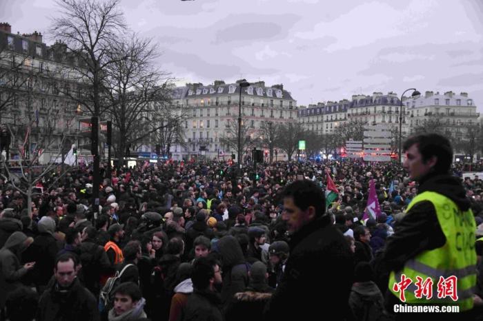 当地时间2019年12月17日,数以万计法国民众在巴黎游行抗议政府退休制度改革方案。中新社记者 李洋 摄