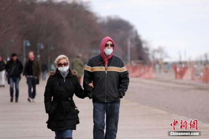 当地时间4月11日,复活节假期,加拿大多伦多市民佩戴口罩在湖滨公园散步踏青。中新社记者 余瑞冬 摄