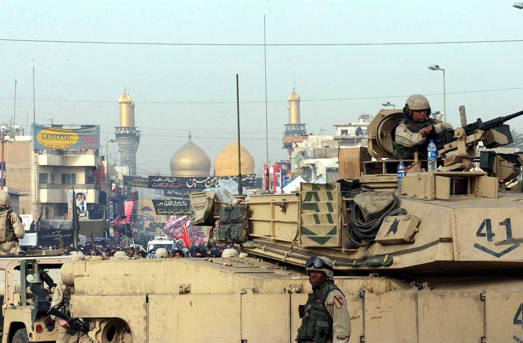 2004年3月2日,在伊拉克首都巴格达,驻伊美军在通往卡兹米亚清真寺的路口警戒。当地时间2日上午10时左右,什叶派穆斯林圣地卡兹米亚清真寺相继发生3起自杀式爆炸。新华社记者黄敬文摄