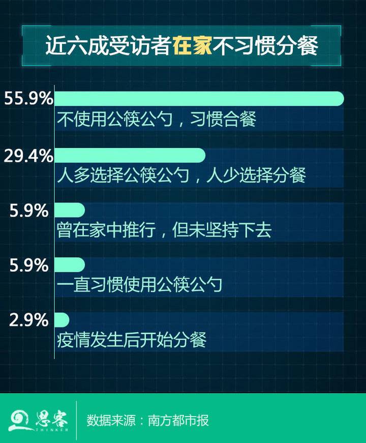 六成受访者表示在家吃饭还不习惯使用公筷公勺或实行分餐。对于传统上倾向于合餐的国人而言,分餐不习惯、显生分、太麻烦,配备公筷公勺或许相对更简单易行。这并不是见外的体现,而是对自己和他人的保护。
