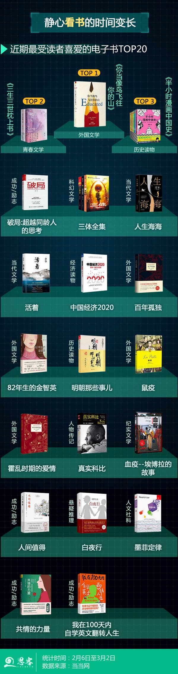 以“读”攻毒,越来越多的人重拾书本,汲取知识的力量。宅家期间,碎片时间被整合,大家有更多的时间投入到高质量阅读。在知乎热门话题“因为疫情待在家中的你们每天都在干什么?”中,有超六成回答称“看书”。极光大数据显示,2月底微信读书日活用户376万人,他们每日使用时长约70分钟,一天能阅读约2万字。其中医疗、疫情相关作品备受关注,《新型冠状病毒感染防护》《鼠疫》《血疫:埃博拉的故事》等图书搜索次数名列前茅。