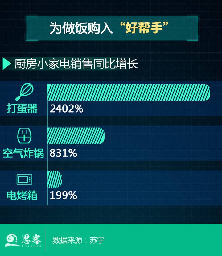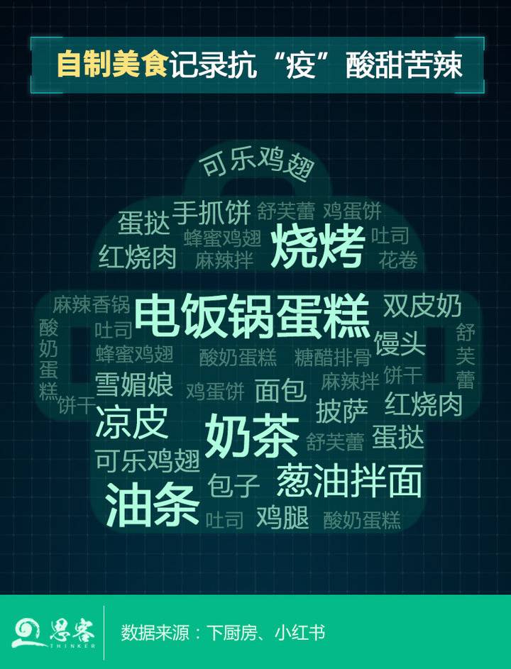 凉皮、蛋糕、奶茶……不能出门也要满足自己的味蕾。美团数据显示,烘焙类商品的搜索量增长了100倍,并带动酵母/酒曲商品销量增长近40倍,饺子皮销量增长了7倍多。“自制蓬松酥脆大油条”是网民在下厨房中做过最多的美食;“电饭锅蛋糕”因其简单好做而成为短视频平台的宠儿,播放量超10亿。