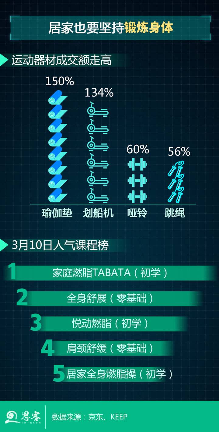简便易行的居家健身方法得以推广,瑜伽、平板支撑、举哑铃等占用场地小的运动受到广泛欢迎。短视频平台上,“宅家也爱做运动”“客厅健身房”“居家健身小妙招”等话题,累计播放次数约30亿。各类热门的“初学”“零基础”课程让运动“小白”能够在家科学健身。受此影响,健身板、瑜伽垫、哑铃、体感游戏手柄等小型健身配套商品热销。