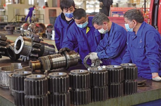 3月19日,西安煤矿机械有限公司车间工人在讨论解决数控加工设备齿轮轴故障问题。该公司自2月17日复工复产以来,开足马力抢时间赶进度,确保国际项目订单和国内订单按期交付。 本报记者 袁景智摄
