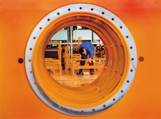 3月19日,陕建机股份公司装配车间工人正在组装主导产品STC6513型塔机上下回转支座。自3月3日起,该公司主导产品和沥青混凝土摊铺机开始向用户发运,现已销售发运塔式起重机31台、摊铺机3台。 本报记者 袁景智摄
