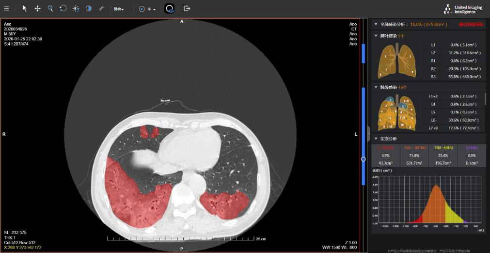 该系统可基于患者CT图像,自动标记病灶,对新冠病毒感染病灶勾画重合率超90%,全肺感染百分比量化误差小于1%,可将5至10分钟的CT阅片时间缩短至1分钟以内。截至目前,联影智能已为全国100多家医院提供了uAI新冠肺炎智能辅助分析系统,完成数万例新冠肺炎患者的筛查与辅助诊断。该系统还驰援海外,在东南亚、欧州及非洲等多个国家启动了试用。