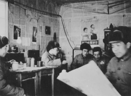 朝鲜战场的环境十分艰苦,志愿军总分社的编辑部常年设在阴暗潮湿的山洞里,驻地附近几次遭到敌机轰炸、扫射。图为总分社何友、李健华、孙大文等同志在山洞内学习。