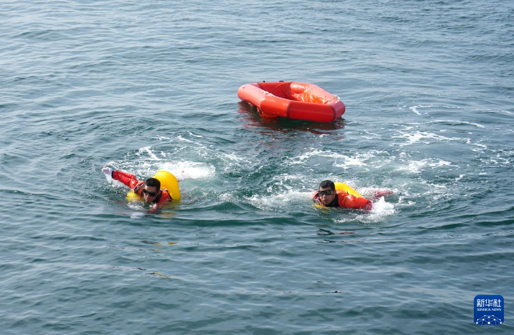 神舟二十号航天员王杰(右)在参加海上救生训练(2023年7月1日摄)。新华社发(孔方舟 摄)