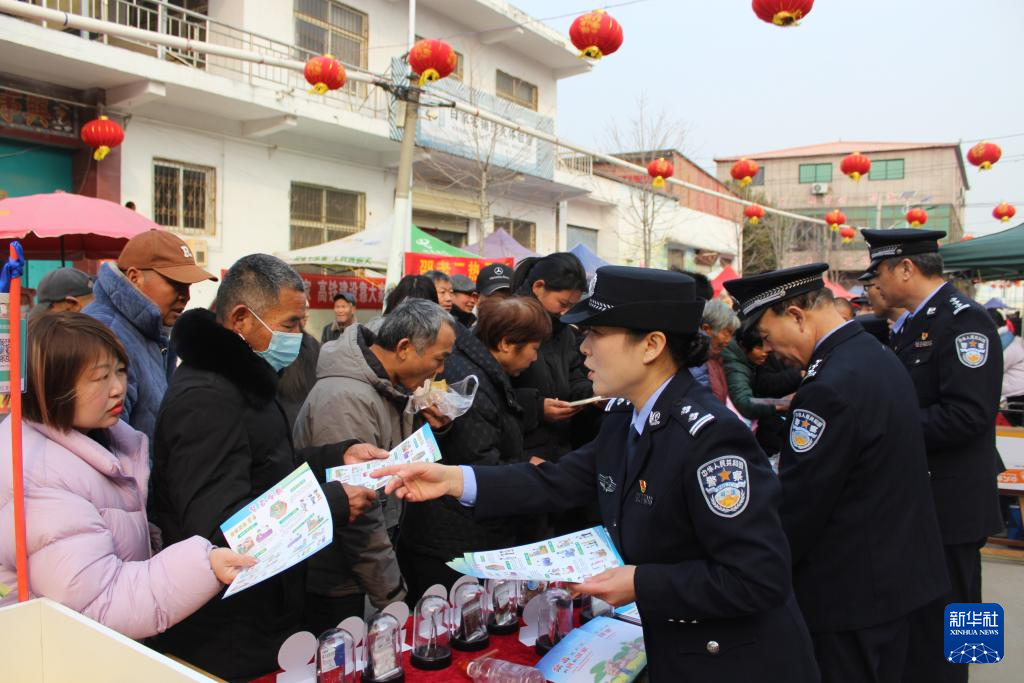 2025年2月18日,在河南漯河黑龙潭镇老应村庙会上,王妙丽(右三)和同事向群众宣传禁毒知识。 新华社发