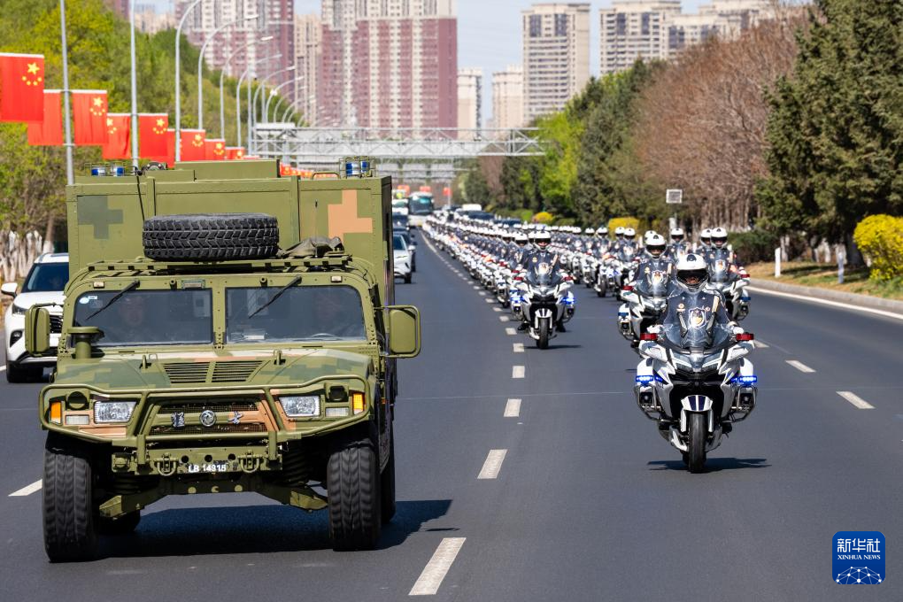 4月22日上午,第十三批在韩中国人民志愿军烈士遗骸由中国空军运-20B从韩国接回辽宁沈阳。这是迎接烈士回家的车队前往沈阳桃仙国际机场。新华社发(杨盼 摄)