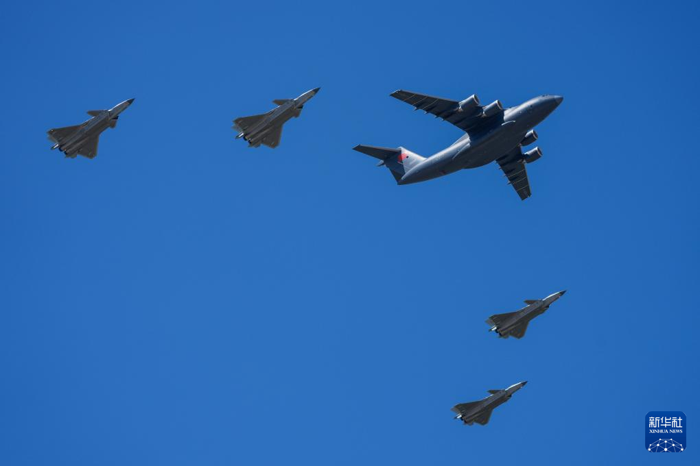 4月22日上午,第十三批在韩中国人民志愿军烈士遗骸由中国空军运-20B从韩国接回辽宁沈阳。这是“双20”五机编队列阵长空,向志愿军烈士致以崇高敬意。新华社发(杨盼 摄)