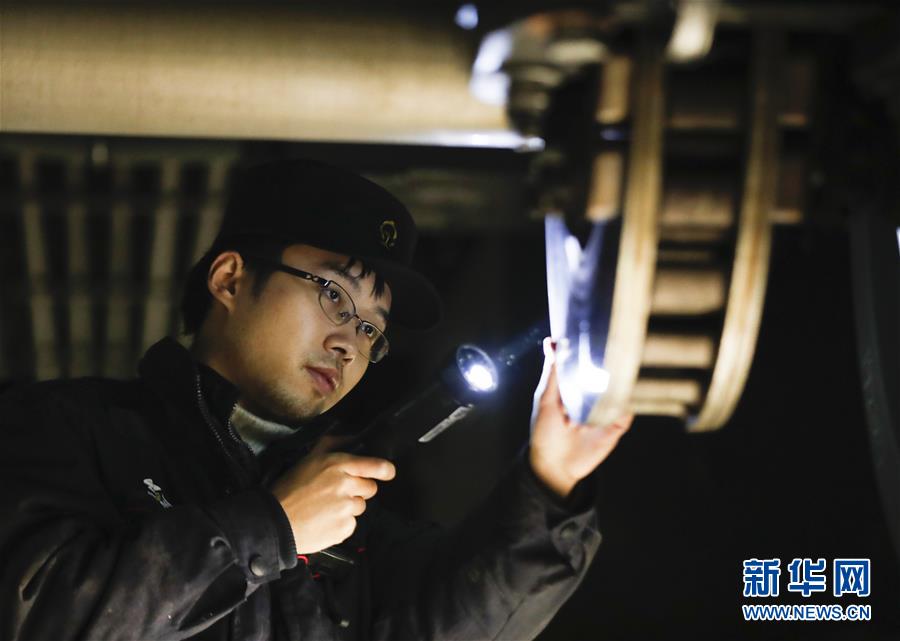 1月10日深夜,检修师在重庆北运用车间检查维护列车底部。 1月10日是2020年春运首日。当晚,在中国铁路成都局集团有限公司重庆车辆段重庆北运用车间内,高铁检修师为忙碌了一天的“绿巨人”动车组列车进行全方位检修。 新华社发(黄伟摄)