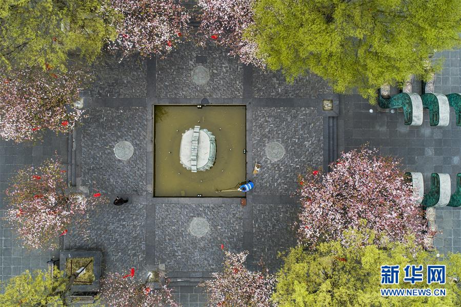 3月14日,环卫工人在四川省南充市阆中古城一处广场打扫卫生(无人机照片)。新华社发(王玉贵 摄)